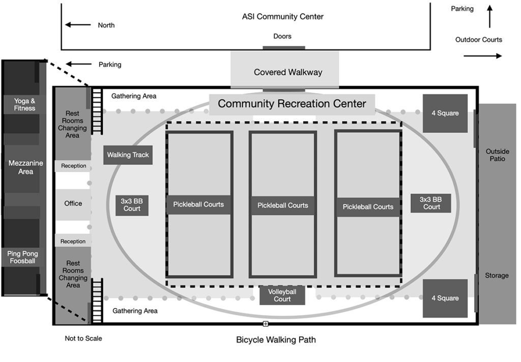 The Community Recreation Center is envisioned as a dynamic hub for community health and engagement, featuring a diverse range of activities tailored to individuals of all ages.  The facility will include multipurpose courts for sports such as pickleball and basketball, a walking track, a dedicated space for fitness classes, and will adhere to ADA compliance to ensure accessibility for individual utilizing walkers or wheelchairs.