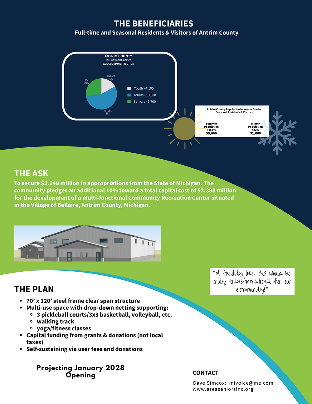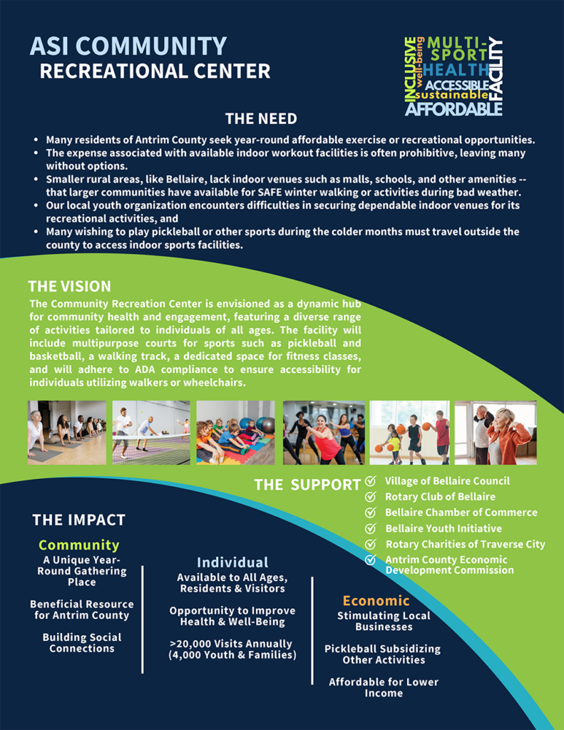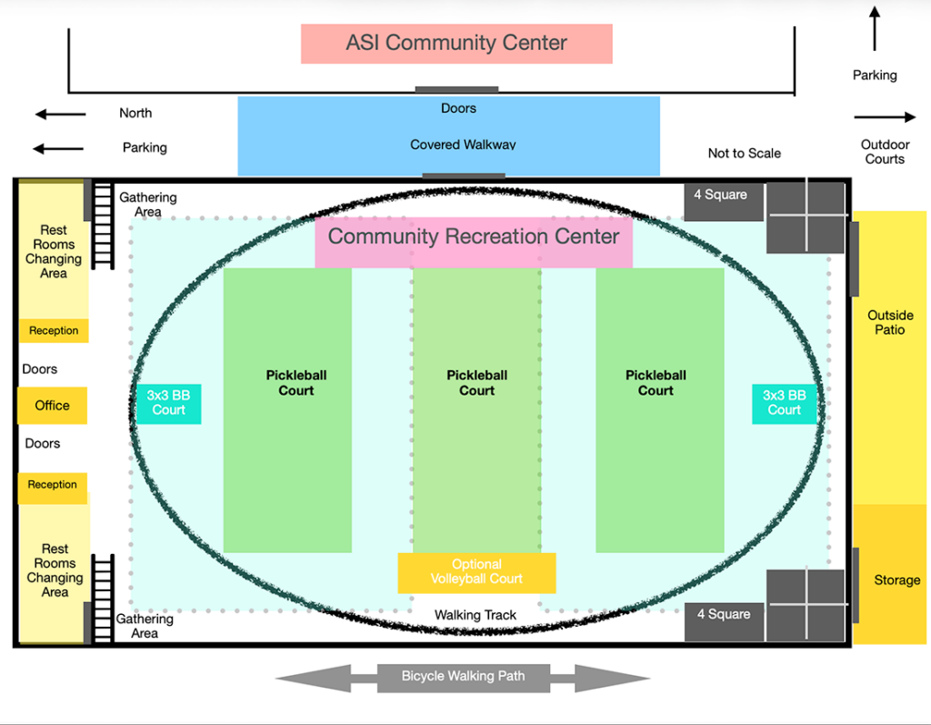 The Community Recreation Center is envisioned as a dynamic hub for community health and engagement, featuring a diverse range of activities tailored to individuals of all ages. The facility will include multipurpose courts for sports such as pickleball and basketball, a walking track, a dedicated space for fitness classes, and will adhere to ADA compliance to ensure accessibility for individual utilizing walkers or wheelchairs.
