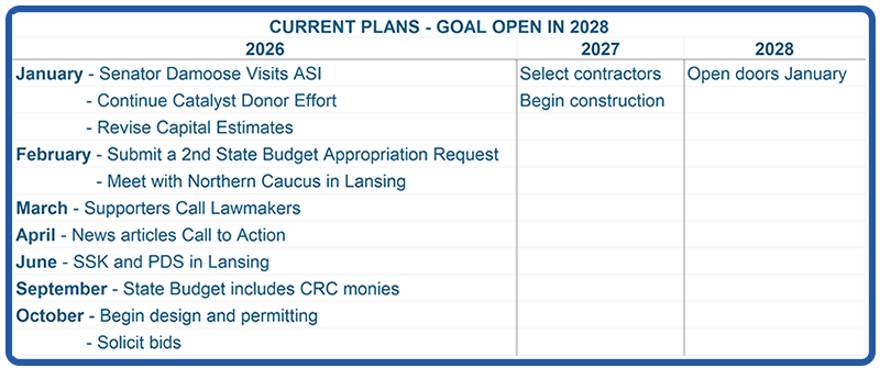 The ASI Community Recreation Center (CRC) project continues to gain momentum with strong local and legislative support. State Senator John Damoose and State Representatives John Roth and Ken Borton met with CRC team members in Lansing on February 18 following submission of a state budget appropriation request seeking $2.14 million toward the project’s $2.38 million capital cost. The team is also engaging members of the Northern Legislative Caucus to build regional support for funding.
