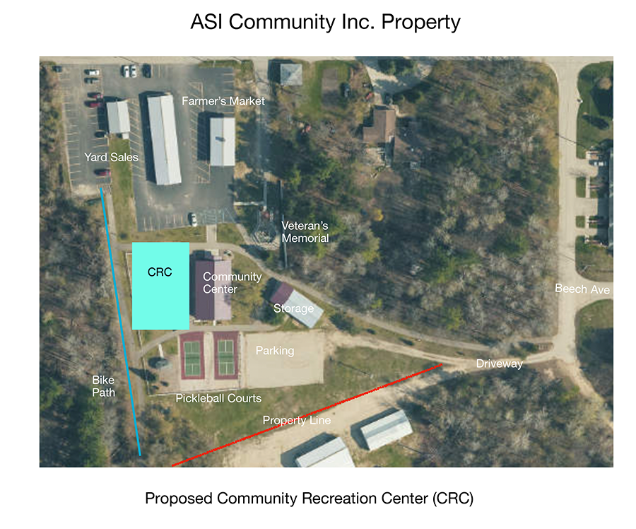 This satellite view provides detail on the location of the proposed Community Recreation Center and the general layout of the ASI Community property: